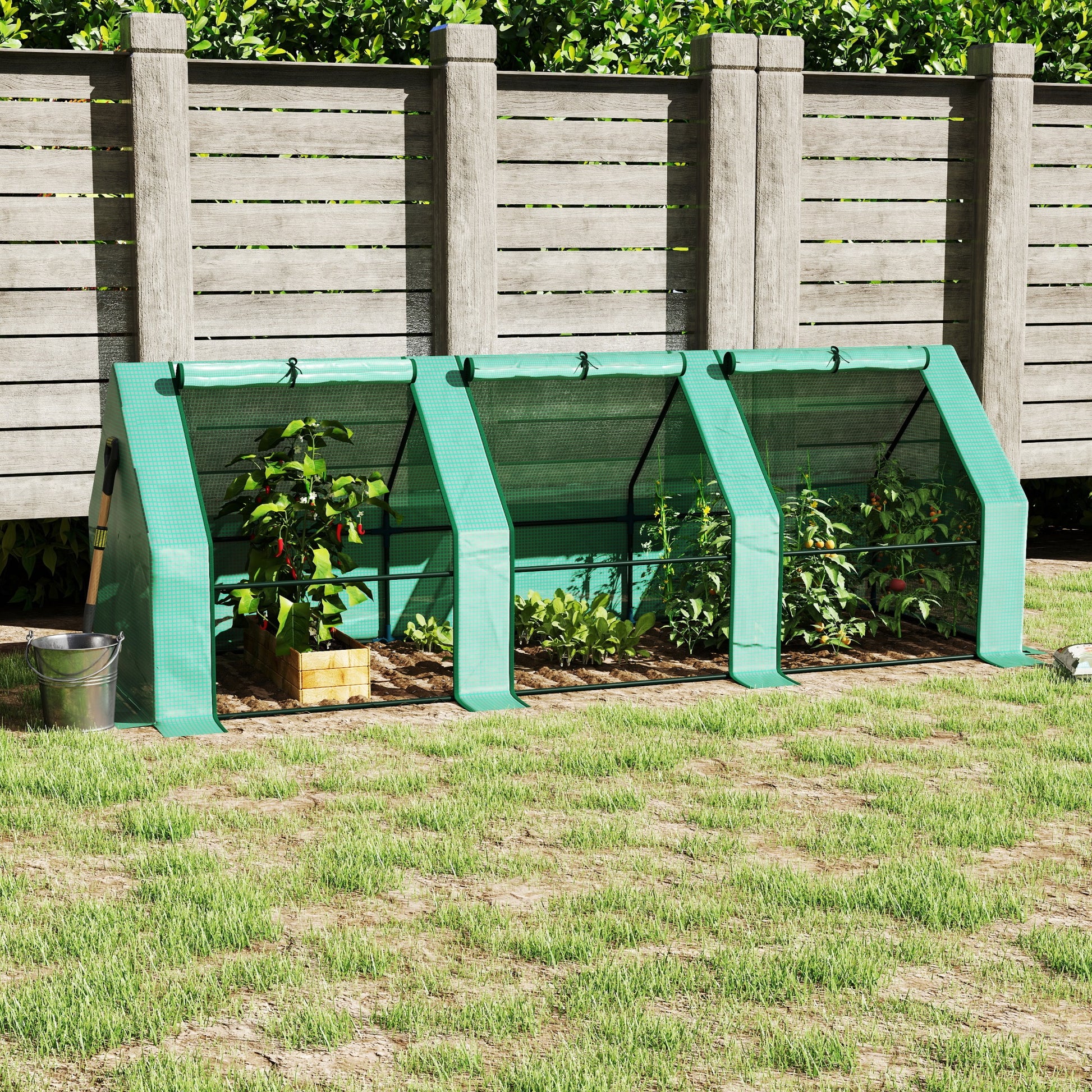 Ben je een enthousiaste tuinier die het hele jaar door actief wil blijven? Zorg ervoor dat je planten de perfecte bescherming krijgen tegen slechte weersomstandigheden met onze kas van Outsunny! Onze kas is gemaakt van waterafstotend en doorschijnende folie en biedt voldoende ruimte om fruit, groenten en bloemen te kweken. Het beschermt niet alleen je planten tegen weer, vogels en insecten, maar bevordert ook groei door temperatuur en vochtigheid te reguleren. Dankzij de extra lange film en de meegeleverde accessoires is montage en bevestiging aan verschillende oppervlakken geen probleem meer! Tip: De folie is 10 cm langer aan de zijkant dan de metalen buizen, de onderste rand kan in de grond worden begraven of met stenen worden verzwaard. Dit maakt de kas stabieler.