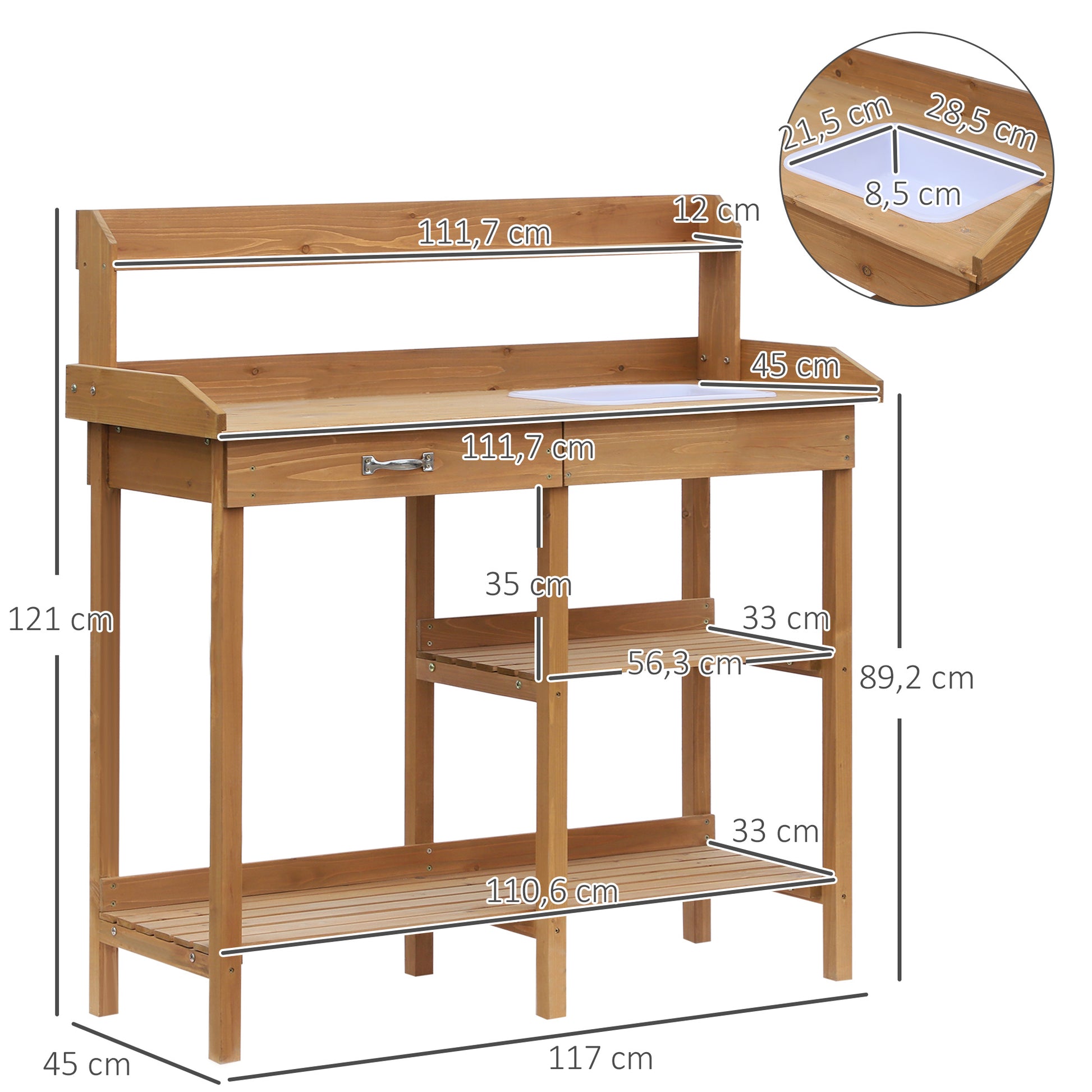 Outsunny Planttafel, Tuintafel, Bloementafel met Dienblad, Tuin, Dennenhout, Naturel, 117 x 45 x 121 cm