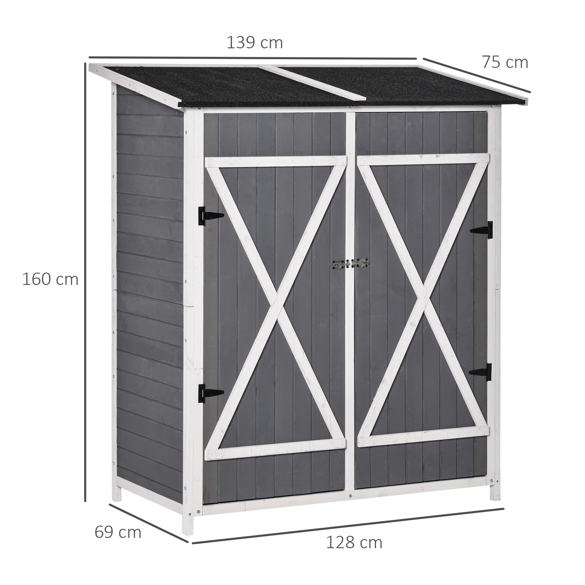 Outsunny Tuinhuis/Gereedschapsschuur met 2 deuren, Gereedschapskast met asfalt dak, Anti-dump ontwerp met grondpennen, Dennenhout, Grijs+Wit, 139 x 75 x 160 cm